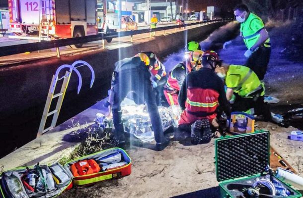 Se acude por accidente de tráfico en la cv-855 cerca de la gasolinera de Mayayo. Salida de la vía de un vehículo que acaba en un canal con el coche boca abajo. Dos mujeres jóvenes, una queda herida con magulladuras propias del golpe pero aparentemente sin mayor gravedad, la otra ocupante queda grave y atrapada en el vehículo sin poder salir, se le practica RCP por parada cardíaca y se solicita asistencia médica urgente pero a pesar de los esfuerzos la liberamos del vehículo ya fallecida. Gracias al trabajo de 5 bomberos de los parques de Orihuela y Almoradí.