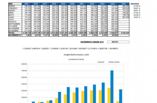Alicante, 17 de agosto de 2025. Alicante ha obtenido en la primera mitad del año los mejores registros de su historia en la recogida selectiva de residuos tanto del contenedor amarillo de los envases como en el del cartón con incrementos porcentuales del 21,94% y del 39,24%, respectivamente, en relación con el mismo periodo del año anterior. La capital de la provincia ha incrementado la recogida separada de estas dos fracciones en un 112% y un 200% avanzando de forma notable en la consolidación de una economía circular en torno al residuo que permita su reaprovechamiento.
