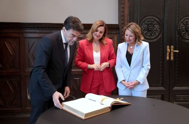 El alcalde de Alicante, Luis Barcala, y la alcaldesa de Castellón, Begoña Carrasco, han realizado este miércoles una visita institucional al Ayuntamiento de Valencia, donde han sido recibidos por su primera edil, María José Catalá, y han firmado en el libro de honor. Este ha sido el primer encuentro institucional de los regidores de las tres capitales de provincia de la Comunidad Valenciana en el actual mandato municipal.