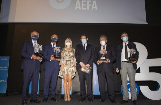 La entrega de premios ha comenzado con el Premio de Honor Manuel Peláez Castillo que ha sido concedido a Luis Moltó. El expresidente de AEFA, Francisco Gómez, la actual presidenta de la asociación y el empresario Enrique Peláez han sido los responsables de otorgar este galardón que reconoce la prolífica carrera empresarial desarrollada por Moltó, que además fue uno de los fundadores e impulsores de AEFA.