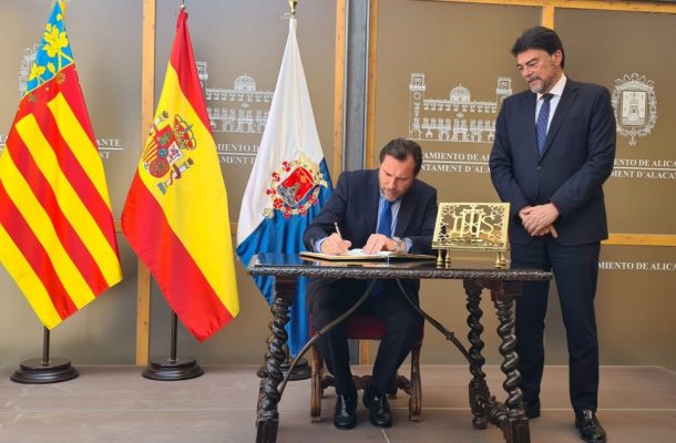 Por su parte, el ministro Puente, que ha firmado en el libro de honor del Ayuntamiento y se ha declarado “encantado” de visitar la ciudad de Alicante, a la que se siente estrechamente vinculado, ha puntualizado que el Gobierno estudia liberalizar el peaje de la autopista de conexión entre la AP7 y Monforte del Cid, como fórmula para descongestionar esta vía. A largo plazo, el ministerio también se plantea la construcción de un tercer carril a su paso por Alicante, con el objetivo de liberar la AP7 de 20.000 vehículos y reducir la siniestralidad. «No hemos venido a hacer anuncios, ni sólo de visita institucional, sino que estamos aquí para trabajar y escuchar a la ciudad de Alicante sobre cuáles son sus necesidades e inquietudes», ha indicado el titular de Transportes.