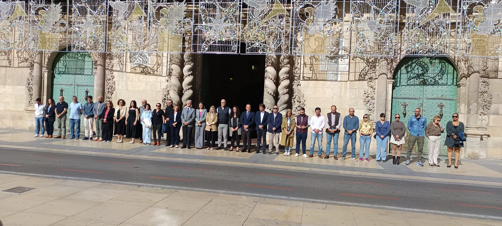 El Ayuntamiento ha guardado un minuto de silencio a las puertas del edificio consistorial en señal de condena por el asesinato de una mujer en Alicante en octubre pasado, recientemente confirmado por el Ministerio de Igualdad como un crimen de naturaleza machista. En la convocatoria han participado miembros de la corporación, representantes de los trabajadores municipales, empleados del consistorio y ciudadanos.