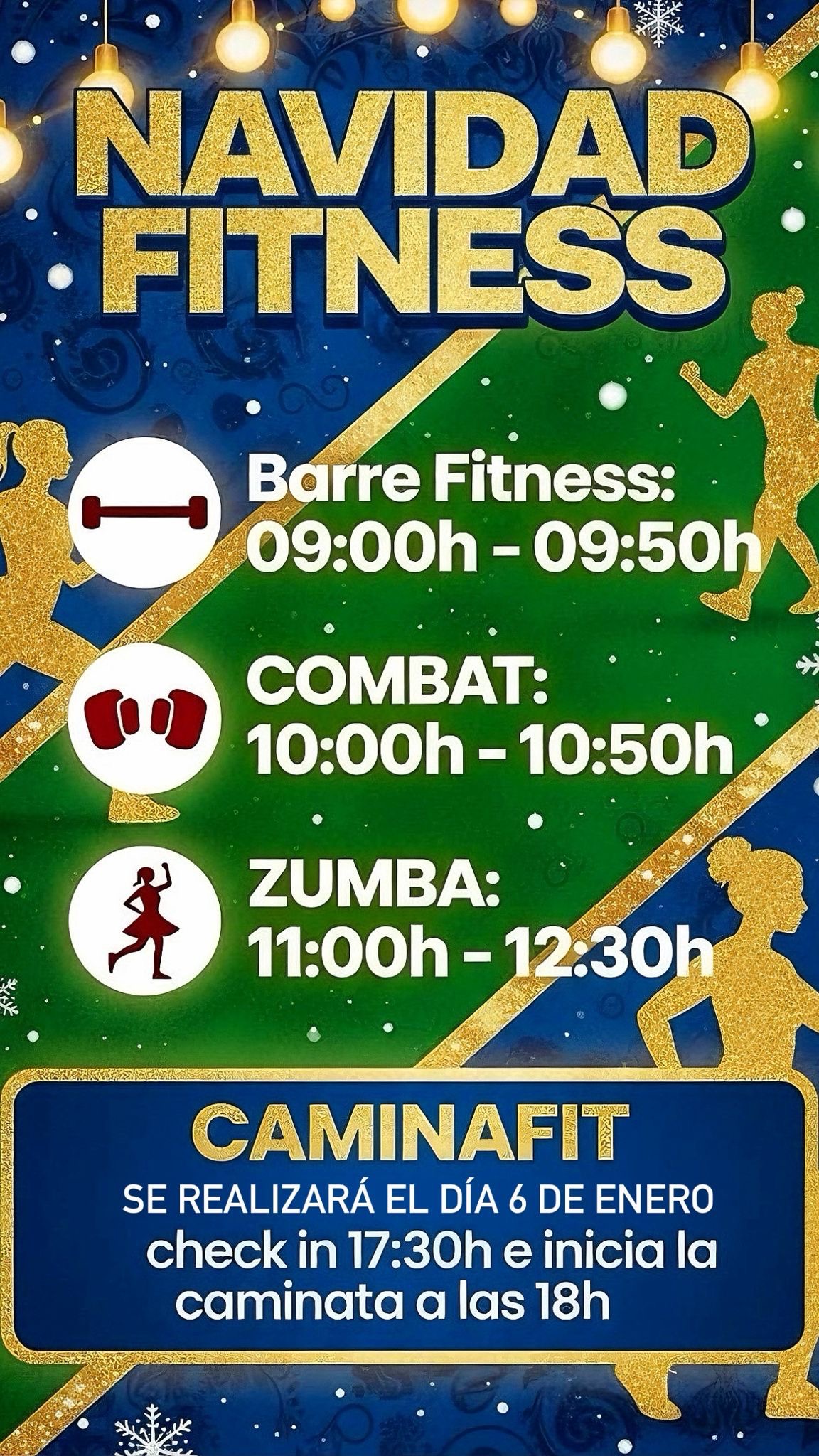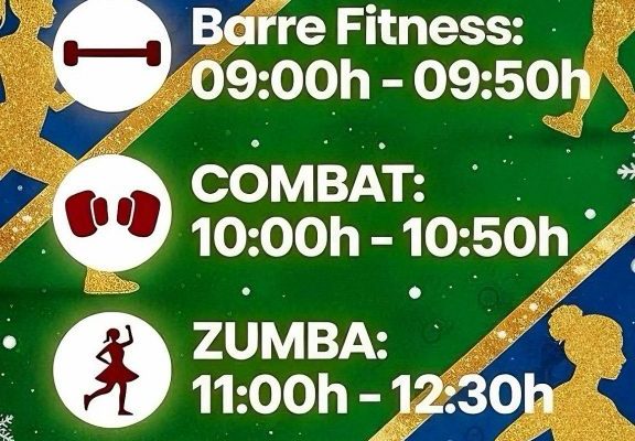 El Navidad Fitness, en la sesión matinal del domingo 4 de enero, comenzará a las 9 horas con el Barre Fitness, hasta las 09.50 horas. Le sucederá una clase de combat (10-10.50 horas) y finalizará con una sesión de zumba (11-12.30 horas). El martes 6 de enero, y en horario vespertino, está prevista la CaminaFit.