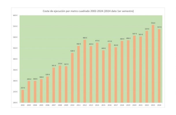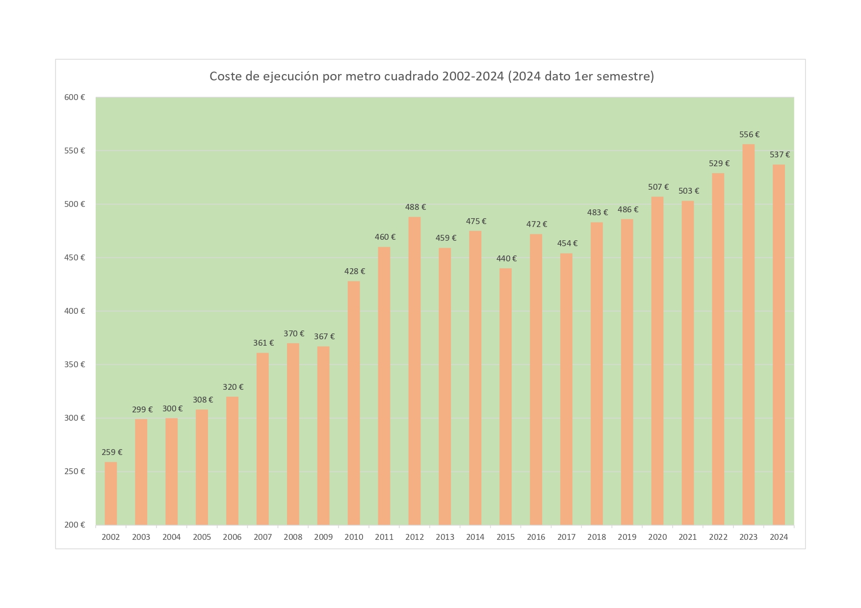 El coste medio de ejecución de vivienda por metro cuadrado con datos acumulados a 30 de junio se sitúa en 537 €, inferior en un 3.4% a los 557 € del total de 2023.