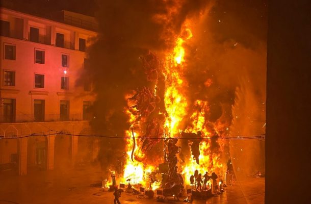 El numeroso público congregado fuera del perímetro de seguridad de la Plaza del Ayuntamiento se ha sorprendido ante ese simulacro de incendio que se ha ido apagando de manera paulatina. Mientras, la parte superior de ‘Identidad’ ha continuado ardiendo hasta que ha comenzado a estallar la traca final y se ha hecho visible el fondo de fuegos artificiales. Éstos han precedido a las llamas que han consumido, progresivamente, una ‘Identidad’ que ha merecido múltiples elogios de quienes se han acercado a la Plaza del Ayuntamiento durante estas Hogueras 2025.