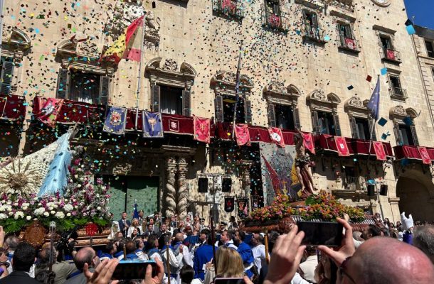 Alicante, 5 de abril de 2026. Seis cañones de alta presión han disparado al mediodía de este domingo más de 500.000 aleluyas en la Plaza del Ayuntamiento de Alicante en el Encuentro que han protagonizado el Santísimo Cristo Resucitado y Nuestra Señora de la Alegría. La procesión conjunta de ambas imágenes, que han escenificado un último Encuentro en la plaza del Abad Penalva, ha puesto el punto final a una Semana Santa con una cifra de participación de hermanos y cofrades, cercana a los 12.000, y con un notable aumento de jóvenes -la gran mayoría de centros educativos- en los 27 desfiles procesionales. La ocupación hotelera, con unos datos que superan el 90%, es otro de los elementos que han caracterizado a estos ocho últimos días.