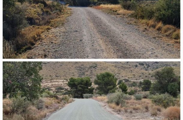 Reparación del Camino Pla Cabeçó, que presentaba irregularidades y dificultades de tránsito, con desbroce y limpieza superficial, aporte de zahorra, nivelación y compactación, y doble tratamiento de riego asfáltico.