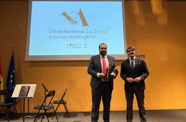 El diputado de Cultura, Juan de Dios Navarro, ha entregado el II Premio Internacional Juan Gil-Albert de Escritura Aforística y del Yo, organizado por el Instituto Alicantino de Cultura, a Raúl Ordás por su obra Inexactos y verdaderos. La segunda edición del certamen, creado para rendir homenaje al insigne autor alcoyano, ha concluido con un acto que ha contado también con la presencia de la directora del IAC, Cristina Martínez, y del director gerente de la Fundación CV MARQ, José Alberto Cortés.