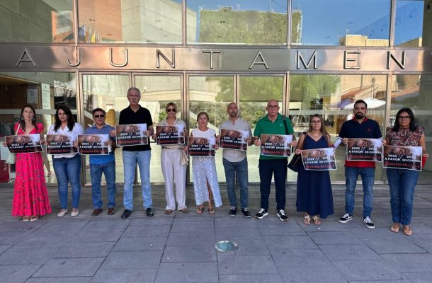 Los concejales han salido a la puerta del Ayuntamiento minutos antes del arranque del pleno extraordinario para palmar su protesta por la negativa de PP y Vox a apoyar la Declaración Institucional a favor de que los estudios se queden en el campus de San Vicente del Raspeig.