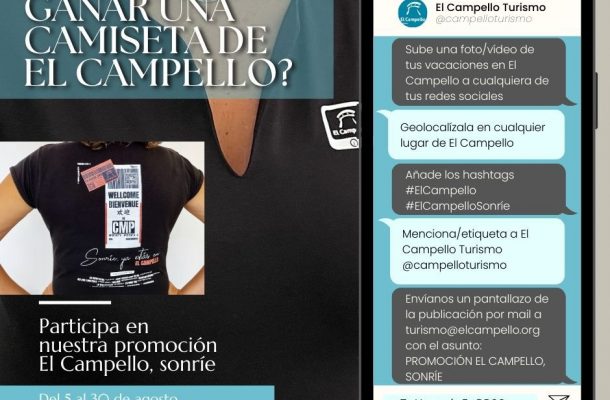 Las hay de diversas tallas, en dos colores (negro y azul), y de hombre y mujer, y participar en esta promoción y ganar una camiseta de es muy sencillo como sube una foto/vídeo de las vacaciones a cualquiera de tus redes sociales., geolocalizarla en cualquier lugar del municipio, añadir los hashtags #ElCampello y #ElCampelloSonríe, y mencionar/etiquetar a “El Campello Turismo” en Facebook, Twitter/X, Instagram, TikTok, Youtube o Linkedin. Después, solo queda esperar el aviso del Ayuntamiento para recoger el regalo en la oficina de Turismo de la calle San Bartolomé.