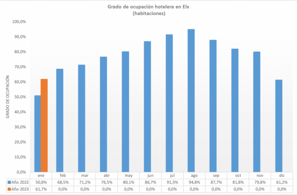 Elche, 24 de febrero de 2023. Elche logró una tasa de ocupación hotelera del 61,7% en enero, lo que representa un aumento de 10,9 puntos porcentuales en comparación con el mismo mes del año anterior. Esta cifra no solo supera ampliamente la tasa de ocupación del 50,8% registrada en enero de 2022, sino que también rebasa el 55,1% alcanzado en el primer mes de 2020. Respecto a diciembre de 2022, la tasa de ocupación aumentó 0,5 puntos.