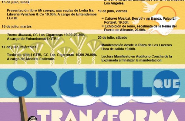 Alicante, 12 de julio de 2024. La Semana del Orgullo comienza este viernes, 12 de julio, en Alicante, con un programa que combina actividades culturales, reivindicativas y festivas y que culminará el sábado 20 de julio con la manifestación y posterior cierre festivo en la Concha de la Explanada.