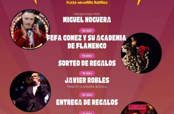 La programación se ha dividido en varias partes y el espectáculo estará presentado por el gran showman Miguel Noguera. La jornada se iniciará a las 18 horas con talleres y el concierto de Fefa Gómez y su academia de flamenco, con posterioridad habrá sorteo de regalos, comida y bebida.