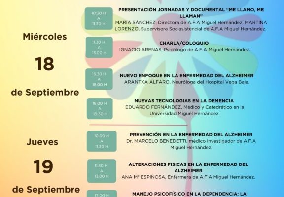El jueves 19 de septiembre está programada a las 10.00h la conferencia “Prevención en la enfermedad del Alzheimer” que impartirá Dr. Marcelo Benedetti, médico investigador de AFA Miguel Hernández, mientras que a las 11.30h la enfermera Ana M.ª Espinosa hablará sobre “Alteraciones físicas en la enfermedad del Alzhéimer”, y a las 17.00h el fisioterapeuta Paco Millán se centrará en el “Manejo psicofísico en la dependencia: la importancia de los pequeños detalles”.