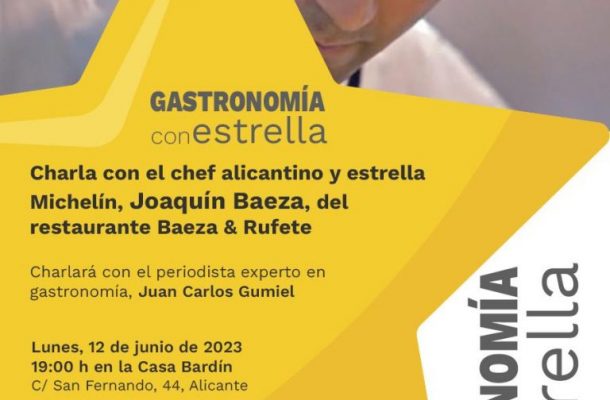A través de esta charla, el responsable del restaurante ‘Baeza & Rufete’ repasará su trayectoria y hablará de su cocina mediterránea, caracterizada por los productos alicantinos y de temporada. Entre otros reconocimientos, Baeza fue nombrado Mejor Cocinero del Año 2014 en el Salón Alimentario de Barcelona, Subcampeón del Concurso Nacional de Cocina del Ajo Morado (2011), Campeón del Trofeo Carmencita de cocina con azafrán (2010), Subcampeón del Concurso Carlos Llorca de Recetas con Pescado Azul (2005) y Mejor Joven Cocinero de la Comunidad Valenciana (2002). La propuesta, que tendrá lugar hoy a partir de las 19:00 horas en la Casa Bardin, estará guiada por el locutor y experto gastronómico Juan Carlos Gumiel.