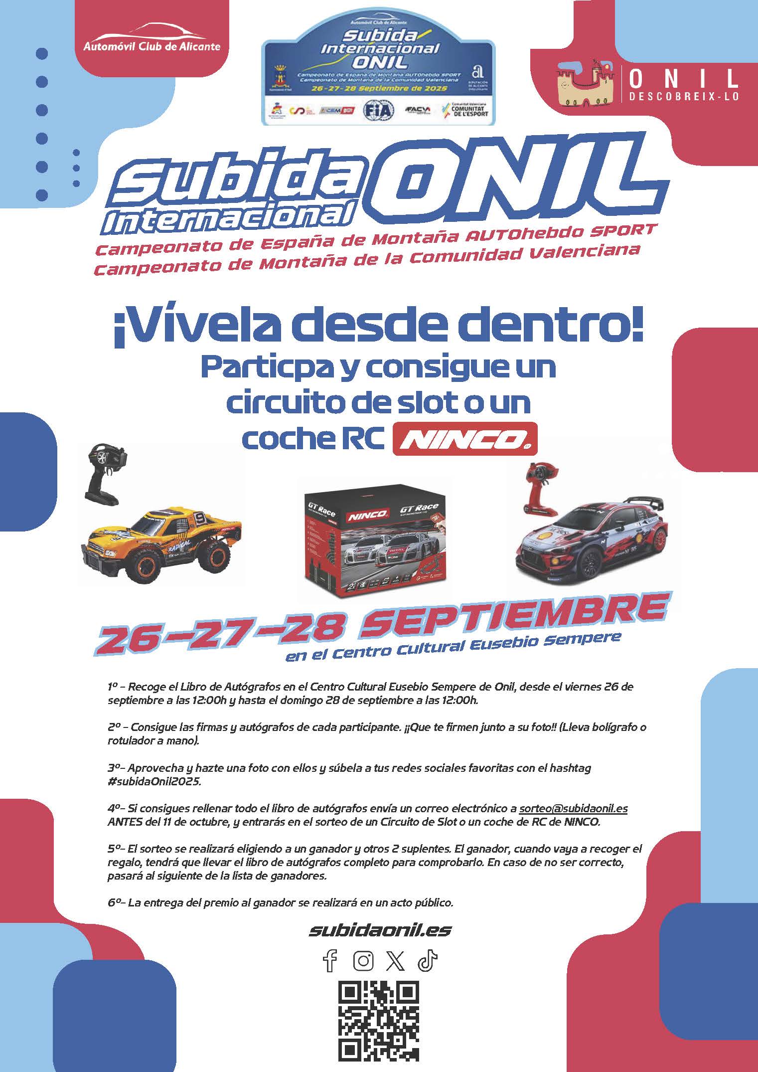 Gracias al éxito de las anteriores ediciones, NINCO se sigue volcando con nuestras pruebas y no ha querido perderse esta nueva y diferente edición en Onil. El concurso Ninco se ha convertido en una referencia dentro del CAMPEONATODE ESPAÑA DE MONTAÑA AUTOhebdo Sport, que tendrá lugar el fin de semana del 26, 27 y 28 de septiembre en el que cientos de niños persiguen a los pilotos participantes para conseguir su autógrafo.