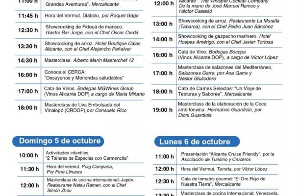 Dentro de la programación el sábado 4 de octubre dará comienzo con los Talleres para niños, para acercarlos al mundo de la gastronomía, la cocina y el producto autóctono, destacando dos talleres de Especias para niños de Carmencita, así como dos nuevos showcookings uno de arroz cocinado por el chef Pedro Juan Sánchez del restaurante La Muralla de Tabarca, y un gazpacho marinero que realizará Javier Tortosa, Chef ejecutivo del Hotel Hospes Amérigo.