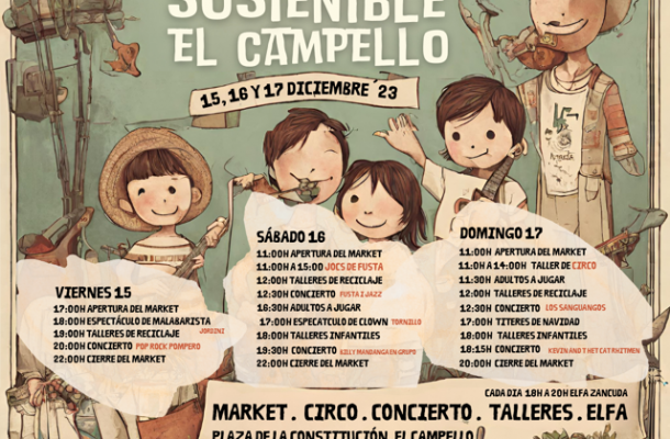 La propuesta “Nadal sostenible El Campello”, arrancará el viernes día 15 a las 17:00 horas. A partir de la apertura del mercado se sucederán espectáculos de malabaristas (18:00), talleres de reciclaje (19:00), y un concierto del grupo Pop Rock Pompero a las 20:00 horas. El recinto cerrará sus puertas a las 10 de la noche.