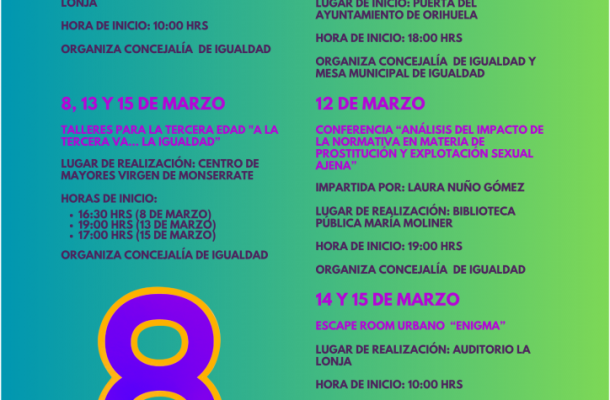La programación continúa los días 14 y 15 de marzo con un escape room urbano titulado “Enigma”, dirigido a alumnos de Secundaria y de Grado Medio, en el Auditorio de La Lonja a las 10.00h, en el que recorrerán las calles de Orihuela a modo de gymkana. Las actividades organizadas por la Concejalía de Igualdad finalizarán el 17 de marzo con la obra teatral para la Tercera Edad “Igualiyay@s” en el Teatro Circo “Atanasio Die” a las 19.00h.