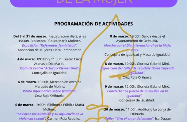 De cara al 8 de marzo, la Glorieta Gabriel Miró será el epicentro de los actos previstos para este día, ya que a partir de las 11.00h albergará una fiesta infantil y juvenil por la igualdad, y por la tarde a las 19.00h tendrá lugar la Marcha por el Día Internacional de la Mujer, desde el Ayuntamiento de Orihuela hasta la Glorieta Gabriel Miró, donde también se contará con una exposición del taller de reciclaje de Cruz Roja Orihuela, titulado “Construyendo igualdad”. En Orihuela Costa, el mismo día, 8 de marzo, en el Centro Comercial de La Zenia Boulevard, a las 12.00h se ofrecerá un concierto bajo el título de “A ritmo con la igualdad”, que correrá a cargo de la cantante Carolina Reymundo.