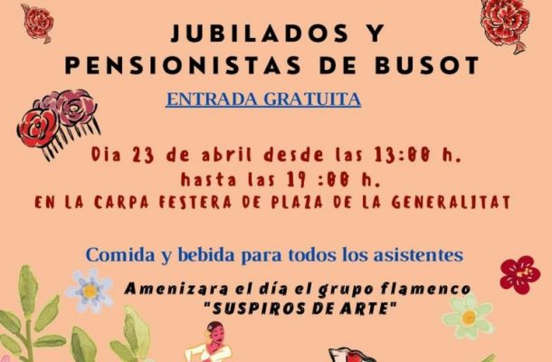 El próximo domingo 23 de abril, el Ayuntamiento organiza una Jornada de Convivencia para la Tercera Edad, jubilados y pensionistas de Busot. A partir de las 13h en la carpa festera de La Plaza de La Generalitat. Tomaremos el aperitivo, comeremos y bailaremos. Amenizará la tarde el grupo Suspiros de Arte.