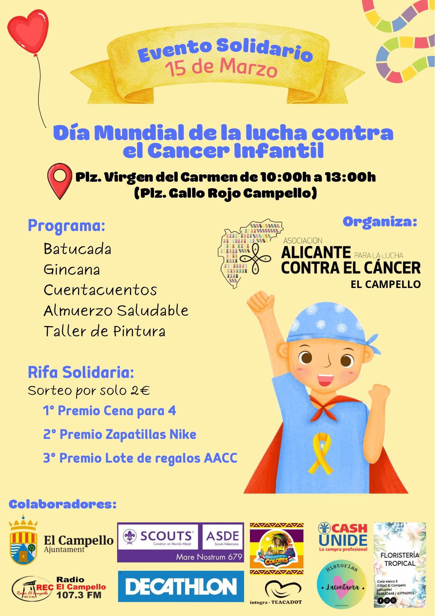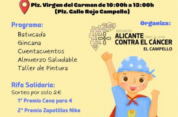 El próximo domingo, si el tiempo no lo impide como hace unos días, la plaza de la Virgen del Carmen de El Campello acogerá una jornada dedicada al Día Mundial de la lucha contra el cáncer infantil, que arrancará a las 10:00 y finalizará a las 13:00 horas, espacio en el que se sucederán una serie de actividades infantiles, bailes, mesas informativas y una rifa solidaria a dos euros para recaudar fondos dedicados a la investigación de esta enfermedad.