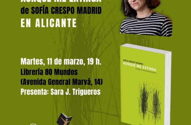 El poemario Aunque me extinga (Editorial Candaya) de Sofía Crespo Madrid, sigue su camino y llega a la Comunidad Valenciana con dos presentaciones en Valencia y Alicante. La autora venezolana, radicada en Madrid, compartirá con los lectores una obra que atraviesa la migración, la memoria y la resistencia con una voz poética potente y personal.