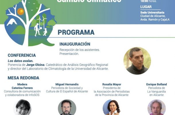 Organizada por la consultora Ideas and Advice, el encuentro se iniciará con la intervención “Los datos avalan” de Jorge Olcina, catedrático de Análisis Geográfico Regional y director del Laboratorio de Climatología de la Universidad de Alicante, y proseguirá con una mesa redonda con periodistas de distintos medios de comunicación de Alicante.