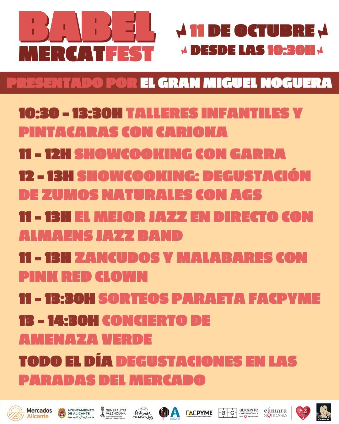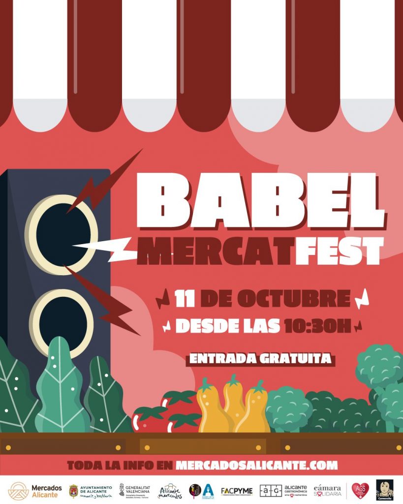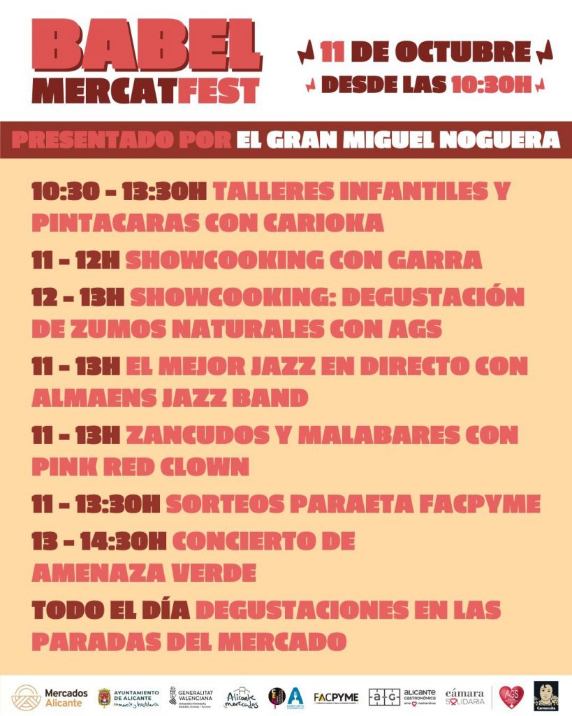 Alicante, 2 de octubre de 2025. El Ayuntamiento de Alicante y la asociación de Comerciantes de los Mercados municipales han preparado una nueva edición del Mercat Fest en esta ocasión en el Mercado de Babel, que se celebrará el sábado 11 de octubre, a partir de las 10,30 horas. Para esta jornada de dinamización comercial se ha previsto un amplio programa de showcookings, talleres infantiles, jazz en directo con Almaens Jazz Band, actividades, zancudos y malabares, sorteos en la paraeta de Facpyme, con animación y música en vivo con el concierto de Amenaza Verde.
