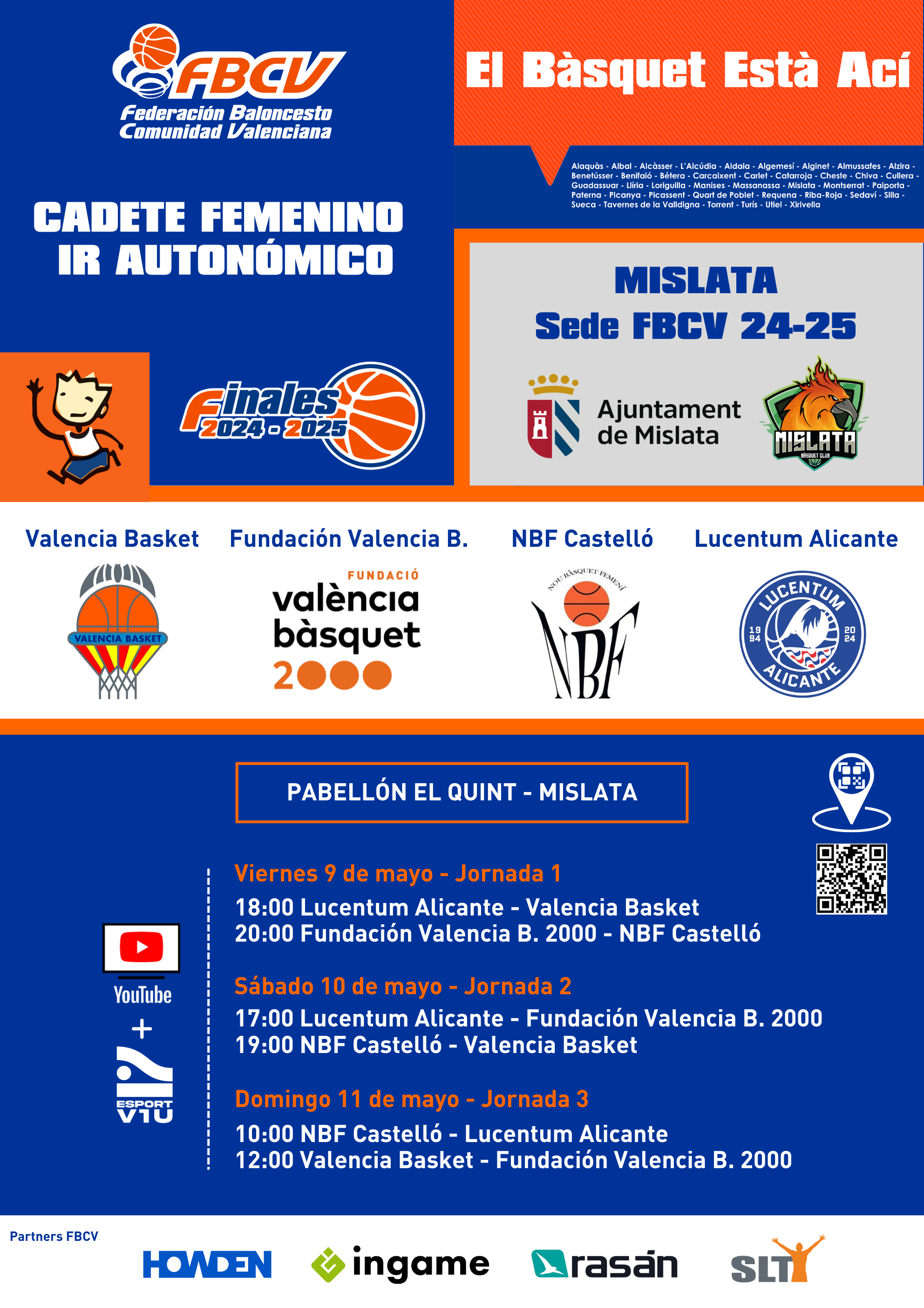 La Fase Final Cadete Femenino Autonómico tendrá lugar en el Pabellón El Quint de Mislata con la presencia de Valencia Basket, Fundación Valencia Bàsquet 2000, NBF Castelló y Lucentum Alicante.
