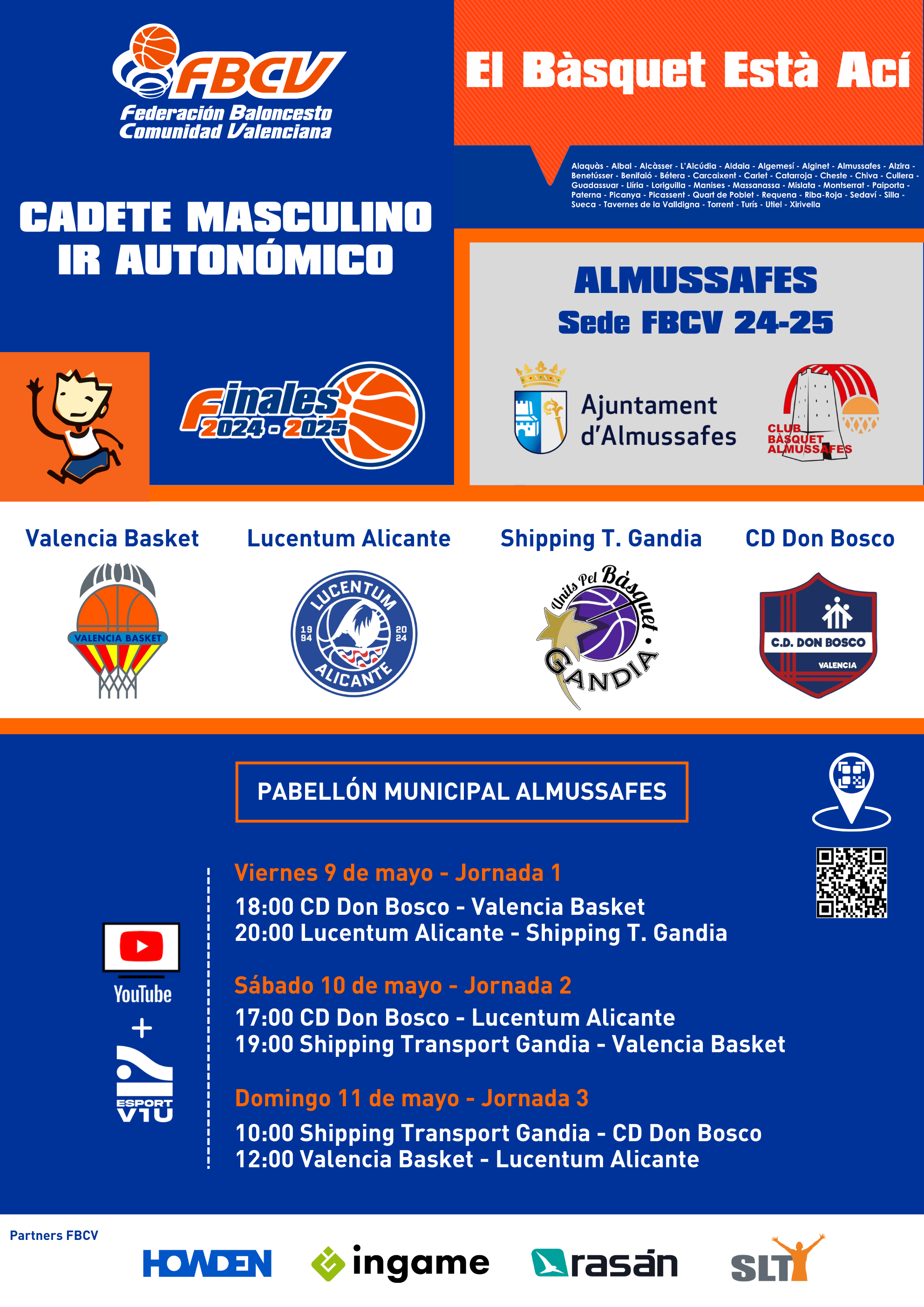 La Fase Final Cadete IR Autonómico será la próxima cita que los aficionados al baloncesto no pueden perderse. La Federación de Baloncesto de la Comunitat Valenciana (FBCV) pone en juego el título de campeón Cadete Autonómico, una competición incluida en los 43º Jocs Esportius de Comunitat. Será del 9 al 11 de mayo, con Almussafes como sede de la competición masculina y Mislata como sede de la competición femenina.