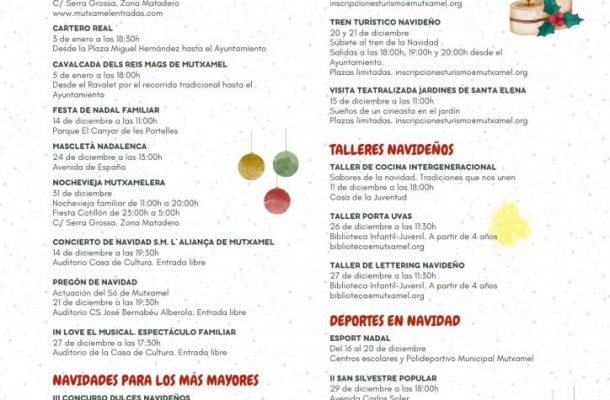 Del 20 al 23 de diciembre se podrá visitar la ya tradicional y esperada Casita de Papá Noel y Feria de Navidad. Las personas interesadas pueden adquirir las entradas a partir del 10 de diciembre a las 16:00 horas en la web www.mutxamelentradas.com. Las visitas se podrán realizar de 11:00 a 14:00 horas y de 17:30 a 20:30 horas según el turno que marque la entrada adquirida. El 27 de diciembre a las 17:30 horas se podrá disfrutar del musical “In Love”, la entrada será gratuita hasta completar aforo.