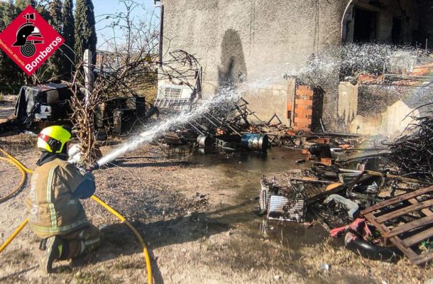 Incendio en un chalet de Vereda Santa Teresa 86 en Elche, con llamas en el tejado con gran acumulación de enseres y basuras que han ardido con mucha llama y humo dejando la vivienda muy afectada por el incendio. Ha sido necesaria la intervención de 10 bomberos de los parques de bomberos de Elche y Crevillente.