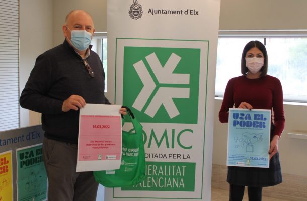 Elche calienta motores para conmemorar el Día Mundial de los Derechos de las Personas Consumidoras el 15 de marzo. La edil del área, Mariola Galiana, y el responsable de la Oficina Municipal de Información al Consumidor (OMIC) ilicitana, el inspector Torcuato Saavedra han informado a mediodía que la Concejalía de Consumo del Ayuntamiento de Elche instalará mañana martes en la Plaça de Baix, de 10:00 a 13:30 horas, una carpa para aconsejar y acercar a la ciudadanía los derechos que poseen como consumidores y consumidoras. A quienes se acerquen, se les obsequiará con una bolsa de la compra reutilizable hasta agotar existencias; una manera de fomentar un consumo responsable y respetuoso con el medio ambiente, tal como ha manifestado Galiana. La responsable municipal ha explicado que Día Mundial de los Derechos de las Personas Consumidoras es una efeméride para “insistir en su protección” y profundizar en los objetivos prioritarios de la OMIC de Elche, que son “asesorar, formar, informar y defender a los y las consumidoras”.