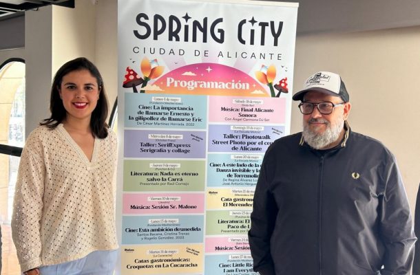 Spring City, la programación cultural gratuita que va unida a Spring Festival, cuenta con más de 20 actividades durante el mes de mayo por toda la ciudad como presentaciones de libros como “Nada es eterno excepto la Carrá”, ciclo de cine -con diferentes documentales entre los que destaca el de C.Tangana, “Esta ambición desmedida”, talleres de serigrafía y fotografía. También catas gastronómicas de la mano de Alicante Street Style, conciertos matinales y rutas gastronómicas y de shopping por más de 30 espacios comerciales como La Vaquería del Camp d’Elx, La Máquina de Escribir y Zoco, entre otros.