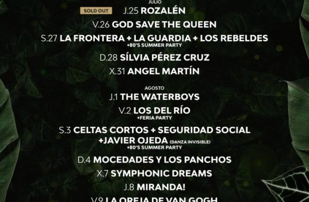 El cartel lo completan God Save The Queen el 26 de julio, La Frontera + La Guardia + Los Rebeldes + 80’s Summer Party el 27 de julio, Silvia Pérez Cruz el 28 de julio, The Waterboys el 1 de agosto, Los Del Río + La Feria Party el 2 de agosto, Celtas Cortos + Seguridad Social + Javier Ojeda de Danza Invisible + 80’s Summer Party el 3 de agosto, Mocedades + Los Panchos el 4 de agosto, Miranda! el 8 de agosto, Music In The Garden con Crystal Fighters, Elyella, Karavana y Olivia el 10 de agosto y cerrará el festival Israel Fernández el 11 de agosto.