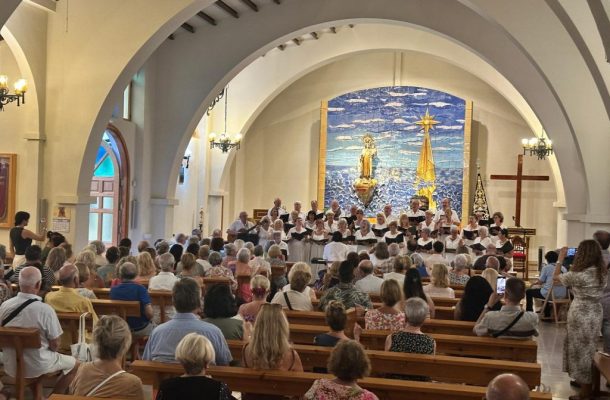 Se trataba del concierto de arranque de las fiestas a cargo de la coral “Alborada” de la Asociación de Mayores (AMEC), cuyos componentes ofrecieron un repertorio muy del agrado del público que llenaba todas las bancadas del templo, entre los que se encontraban la concejala de Fiestas y Tradiciones, Marisa Navarro, y los también ediles Marcos Martínez, María Jesús Bernabeu y Paco Toni Palomares, junto con el párroco Pedro Juárez, representantes de la Cofradía de Pescador y fieles de la Virgen, además de una nutrida representación de AMEC.