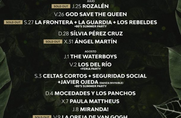 El cartel lo completan God Save The Queen el 26 de julio, Silvia Pérez Cruz el 28 de julio, The Waterboys el 1 de agosto, Los Del Río + La Feria Party el 2 de agosto, Celtas Cortos + Seguridad Social + Javier Ojeda de Danza Invisible + 80’s Summer Party el 3 de agosto, Mocedades + Los Panchos el 4 de agosto, Paula Mattheus el 7 de agosto, Miranda! el 8 de agosto, Music In The Garden con Crystal Fighters, Elyella, Karavana y Olivia el 10 de agosto y cerrará el festival Israel Fernández el 11 de agosto.