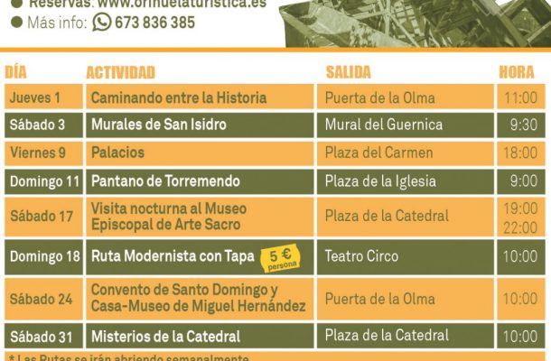 Las inscripciones para todas estas actividades estarán disponibles semanalmente. Los interesados pueden reservar su lugar a través del sitio web oficial www.orihuelaturistica.es o mediante WhatsApp al 673 836 385.