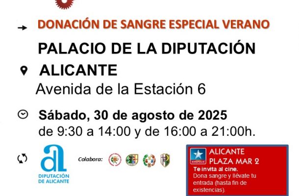 28-08-25.- El Palacio de la Diputación de Alicante acoge este sábado 30 de agosto un Maratón de Donación de Sangre en colaboración con el Centro de Transfusión de la Comunitat Valenciana. El objetivo de esta iniciativa solidaria, que se desarrollará en horario de 09:30 a 14:00 horas y de 16:00 a 21:00 horas, es incentivar las donaciones ante el descenso de reservas que se produce durante la época estival.