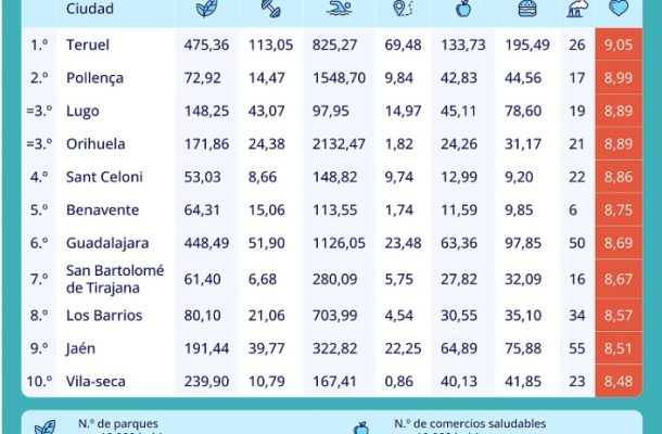 Por su parte, Orihuela es la número uno en cuanto a diversidad de espacios para nadar, con 2 132,47 opciones por cada 10 000 habitantes. Aunque no destaca tanto por sus rutas para caminar, la abrumadora cantidad de opciones acuáticas convierten a esta ciudad en un centro de bienestar único, en especial para quienes prefieren nadar que pasear.