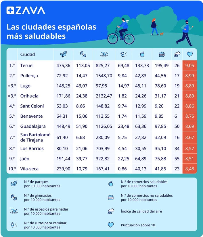 Teruel, la ciudad aragonesa del mudéjar y del amor, obtiene el primer puesto con una impresionante puntuación de 9,05 sobre 10. La modesta, pero impresionante ciudad cuenta con 475,36 parques y 825,27 espacios acuáticos por cada 10 000 habitantes, creando un ambiente donde las actividades al aire libre no solo se fomentan, sino que resultan ser inevitables. Además, esta urbe cuenta con más de 100 espacios para ejercitarse por cada 10 000 habitantes y cerca de 70 rutas para caminar, lo que la convierte en el paraíso para los amantes de la vida fitness. Con un índice de calidad del aire de tan solo 26, Teruel combina aire limpio con abundantes espacios para moverse, respirar y vivir con plenitud.