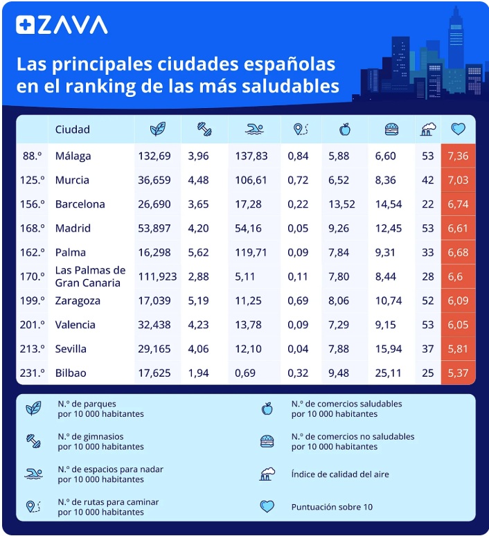 Dentro de las metrópolis, Málaga logra la puntuación más alta de 7,36 y se debe a su gran número de parques y espacios para nadar. Barcelona obtuvo un respetable 6,74, favorecida por su buen índice de calidad del aire de 22.