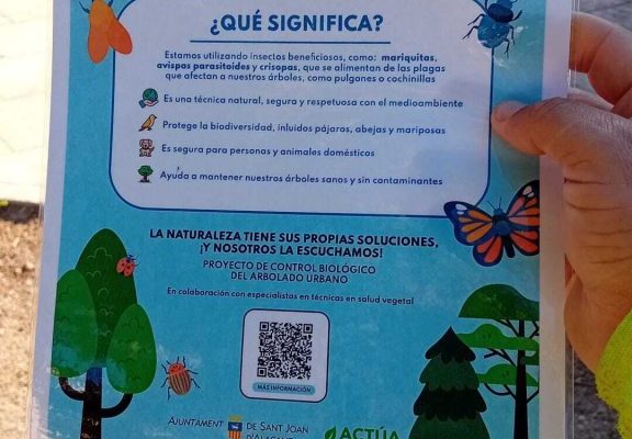 El Ayuntamiento de Sant Joan d’Alacant ha puesto en marcha un sistema de control biológico del arbolado urbano a través del uso de plagas de insectos. La Concejalía de Parques y Jardines y la empresa adjudicataria del mantenimiento de zonas verdes Actúa Servicios y Medio Ambiente S.L, están empelando insectos beneficiosos, que ayudan a mantener los árboles sanos, sin contaminantes, al tiempo que son seguros para personas y animales domésticos, y se protege la biodiversidad, incluidos pájaros, abejas y mariposas.