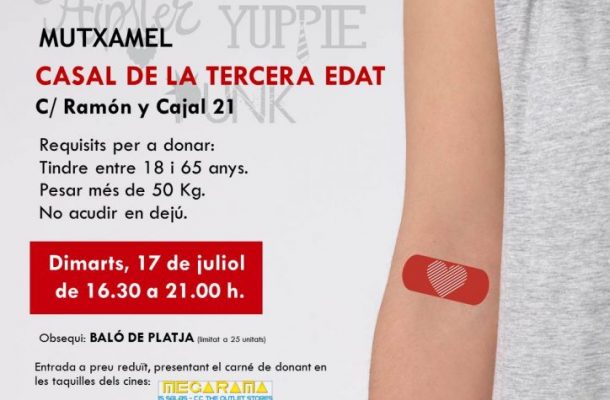 El próximo martes, 17 de julio, de 16:30h a 21:00h puedes salvar tres vidas. Acude al Casal de la Tercera Edad en la Calle Ramón y Cajal, 21 (Mutxamel)