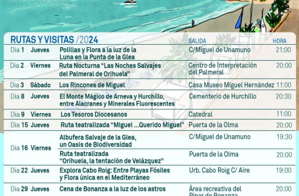 “En las rutas de agosto los asistentes podrán disfrutar de la costa oriolana, así como de las noches y rutas culturales e históricas”, ha concluido el edil de Turismo. Las rutas se irán abriendo semanalmente. Más información en la web www.orihuelaturistica.es o en el WhatsApp 673 836 385.