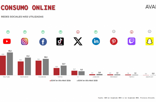 Alicante, 22 de abril de 2025. En el consumo online en Alicante, la mensajería instantánea mantiene su posición de líder indiscutible con un 86,8% de penetración, muy por delante del consumo de RR.SS (71%) y de la categoría de búsqueda de información (52,9%). YouTube crece y refuerza su posición en la provincia como la red social más consumida con un 53,2%, con una importante ventaja respecto a Instagram (41,2%) y de Facebook (38,3%).